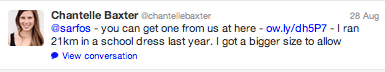 Everyday I still have the same conversation with people about the value of social media and in particular twitter. Why would I want to know what everyone had for lunch? As many of us know, this does not define twitter or the reason that the majority of people on there now use it as their number one news, information and knowledge source. You have direct access to politicians, journalists, athletes, chefs, specialists of all and any fields. It is real and real-time. And as I experience every day it is a valuable and wise community. One that is even willing to help me locate my perfect marathon dress. Awesome.